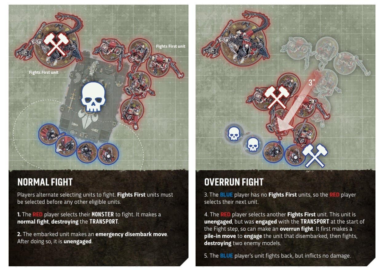 - Overrun fights keep units from whiffing the phase: if you were eligible but your contact target died before you swing, you can Pile In again and hit something nearby instead of shadowboxing.