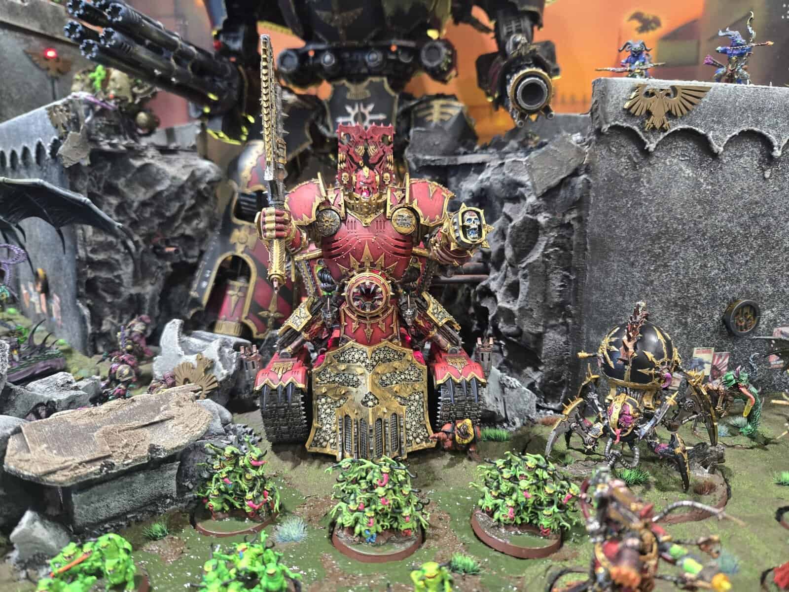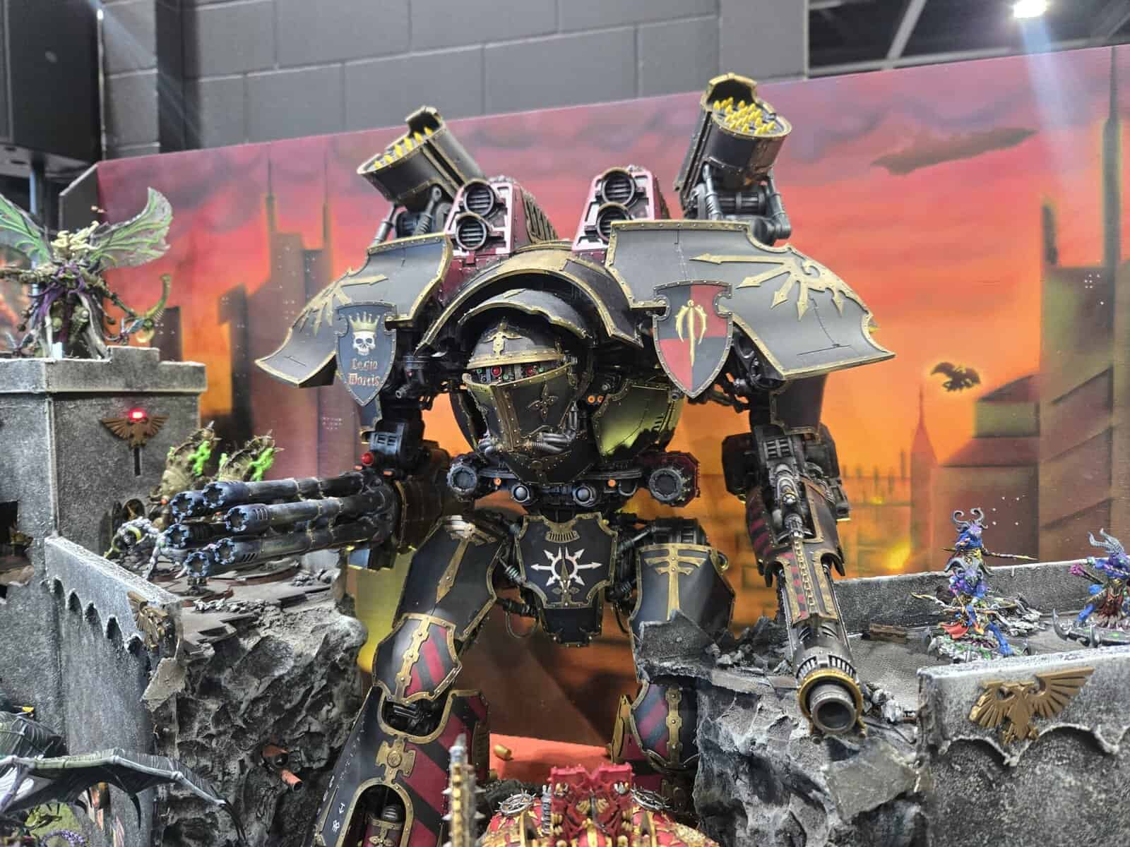 This board had a giant Titan hanging around a castle backdrop, and that alone was enough to pull people in. Even with Fulgrim on the table, the Titan still managed to tower over everything and make the whole display feel huge.