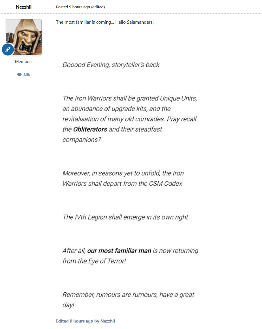According to forum regulars like Bool, the Iron Warriors could be breaking free from the Chaos Space Marines codex to claim their own identity with a supplement.