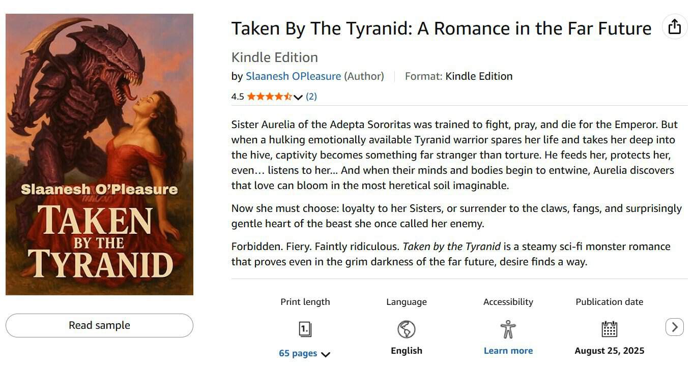 Taken by the Tyranid 2Here’s where it gets even funnier. If somebody really wanted 40k-themed smut, or something close enough to it, they did not need to fire up the AI blender and list it on Amazon. The fanfic crowd solved that problem years ago.