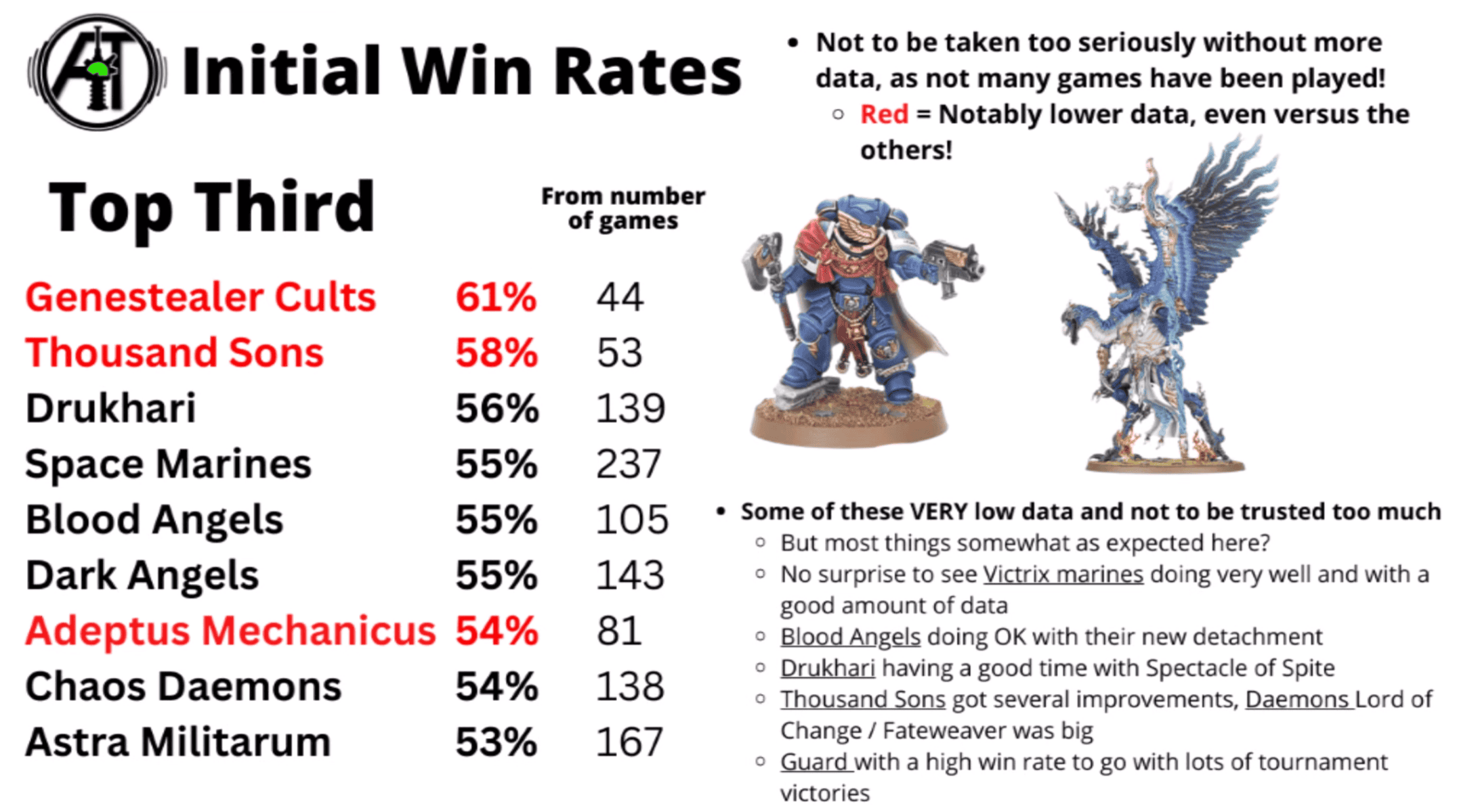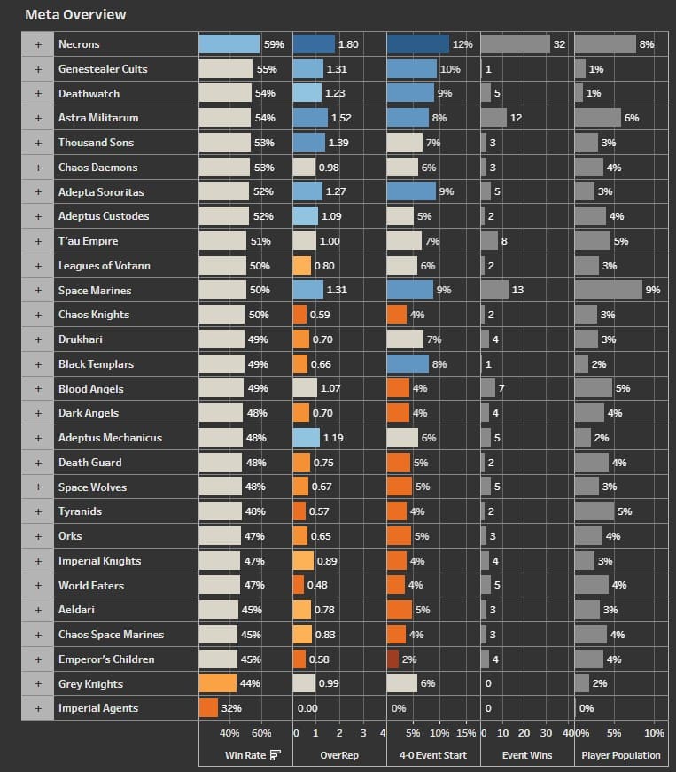 High player count can be detrimental to the overall performance of a faction for example marines are the starter army for most players however new players aren’t as skilled as most players and can drag the statistics down however a complicated faction like admech with its low representation statistically bumps its numbers up as the more skilled players take to the stage also admechs price tag is just stupid in comparison but the point stands that skill will always beat over-representation