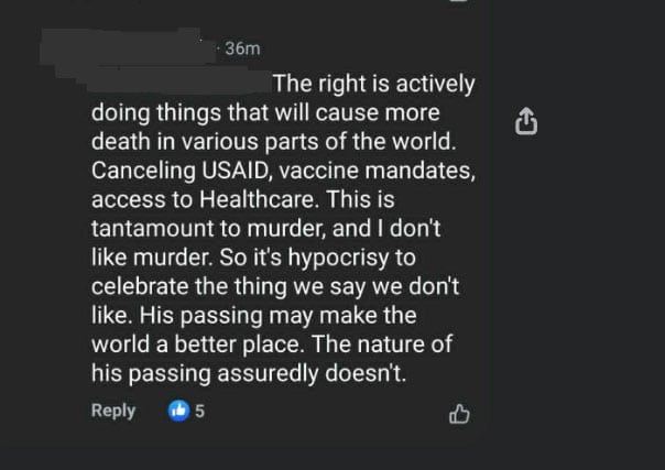 “The right is actively doing things that will cause more death in various parts of the world. Canceling USAID, vaccine mandates, access to Healthcare. This is tantamount to murder, and I don’t like murder. So it’s hypocrisy to celebrate the thing we say we don’t like. His passing may make the world a better place. The nature of his passing assuredly doesn’t.”