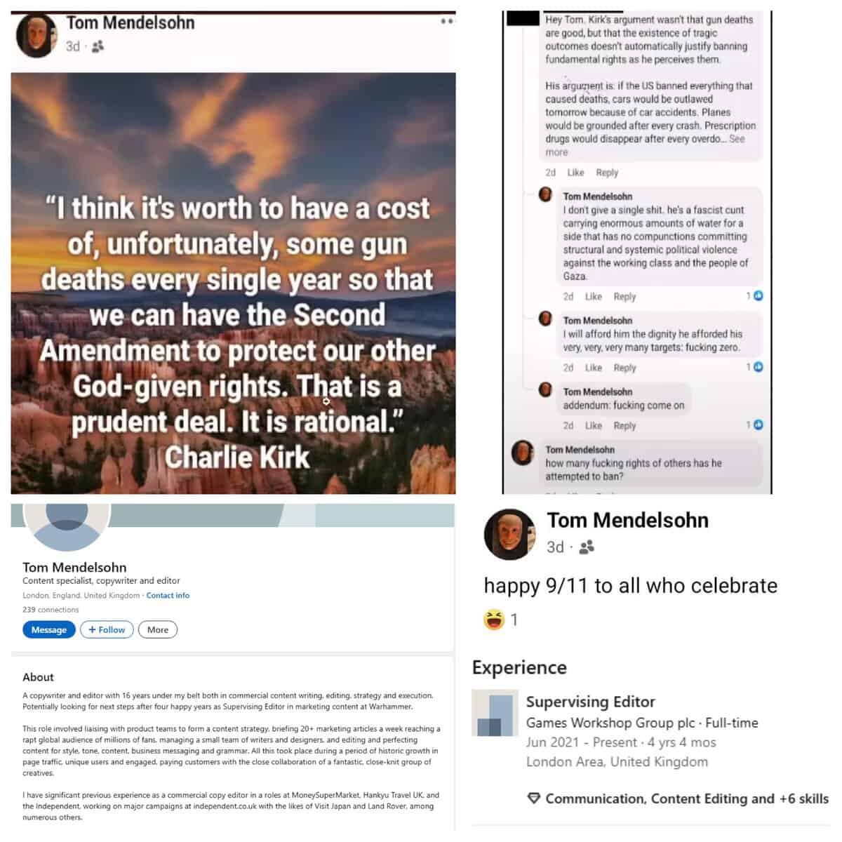 Games Workshop, producer of warhammer, a hobby primarily aimed at teenage boys, employs Tom Mendelsohn, a man who in recent days CELEBRATED the September 11th attacks and cheered the assassination of Charlie Kirk.