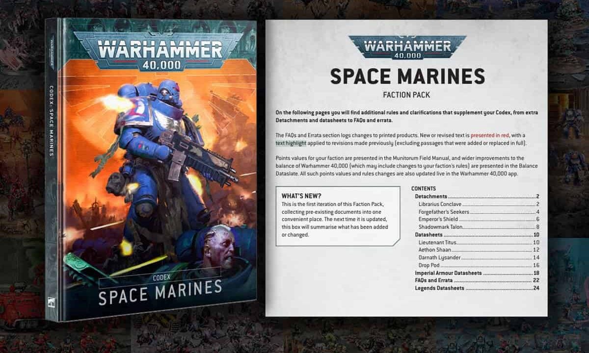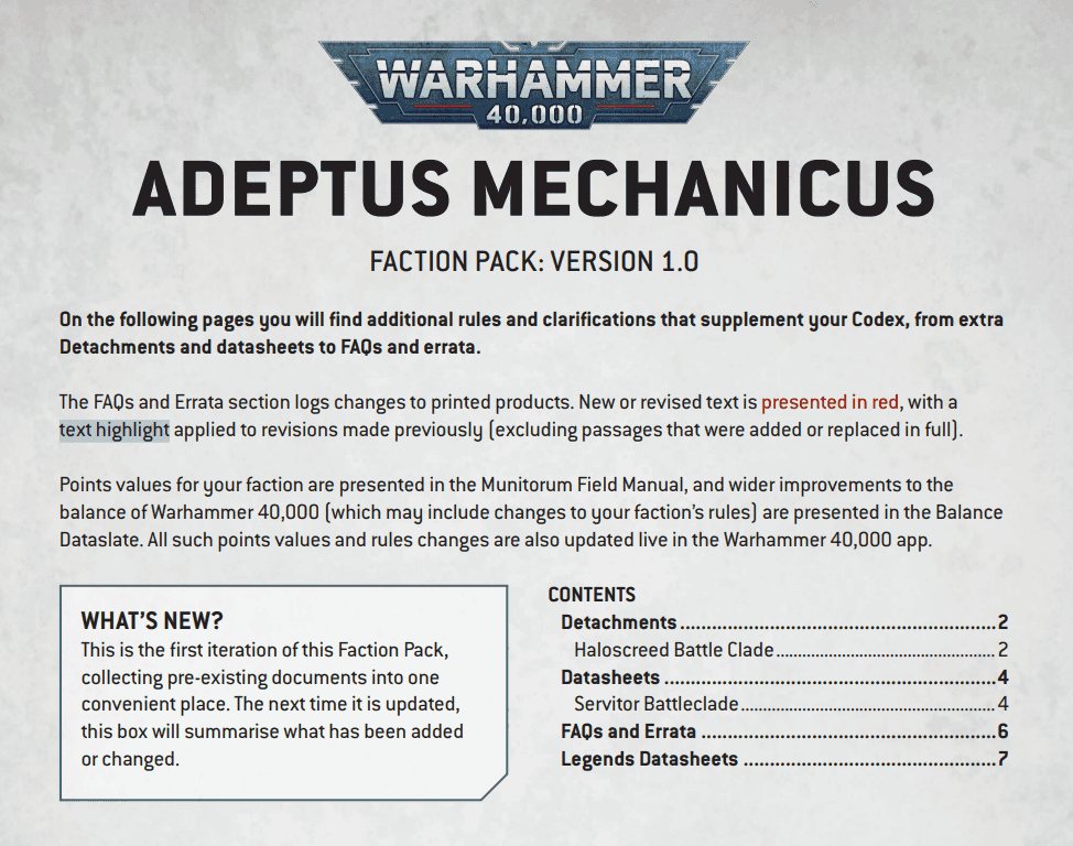 Warhammer 40k faction packs (you can download all of them here) now act as your one-stop rules shop. Think of it as a tidy folder containing your faction’s errata (like Space Marines), new detachments, and Legends units; all with a contents page and a color-coded changelog so you can tell what’s new at a glance.