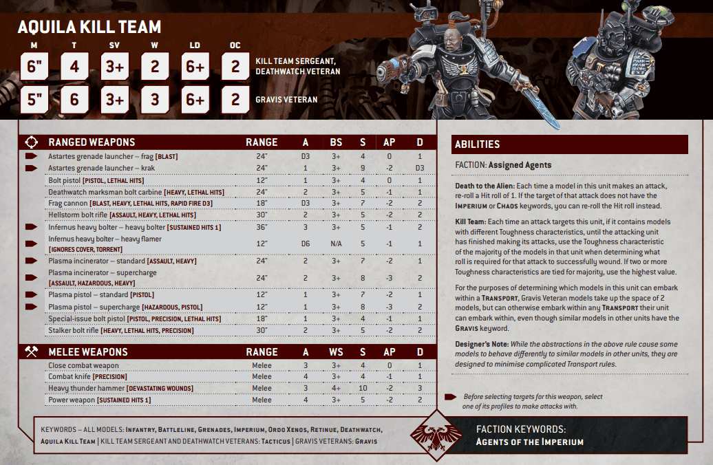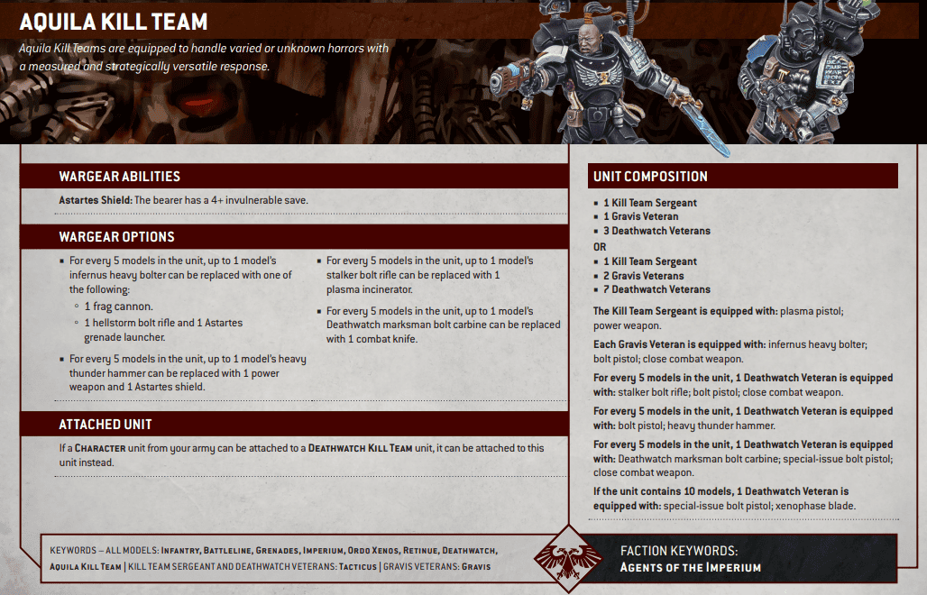 The new Aquila Kill Team rules have every role at once. You get classic power armored vets mixed with chunky Gravis bruisers, all swinging an armory’s worth of exotic guns, flamers, frag cannons, and blades sharp enough to ruin anyone’s day.