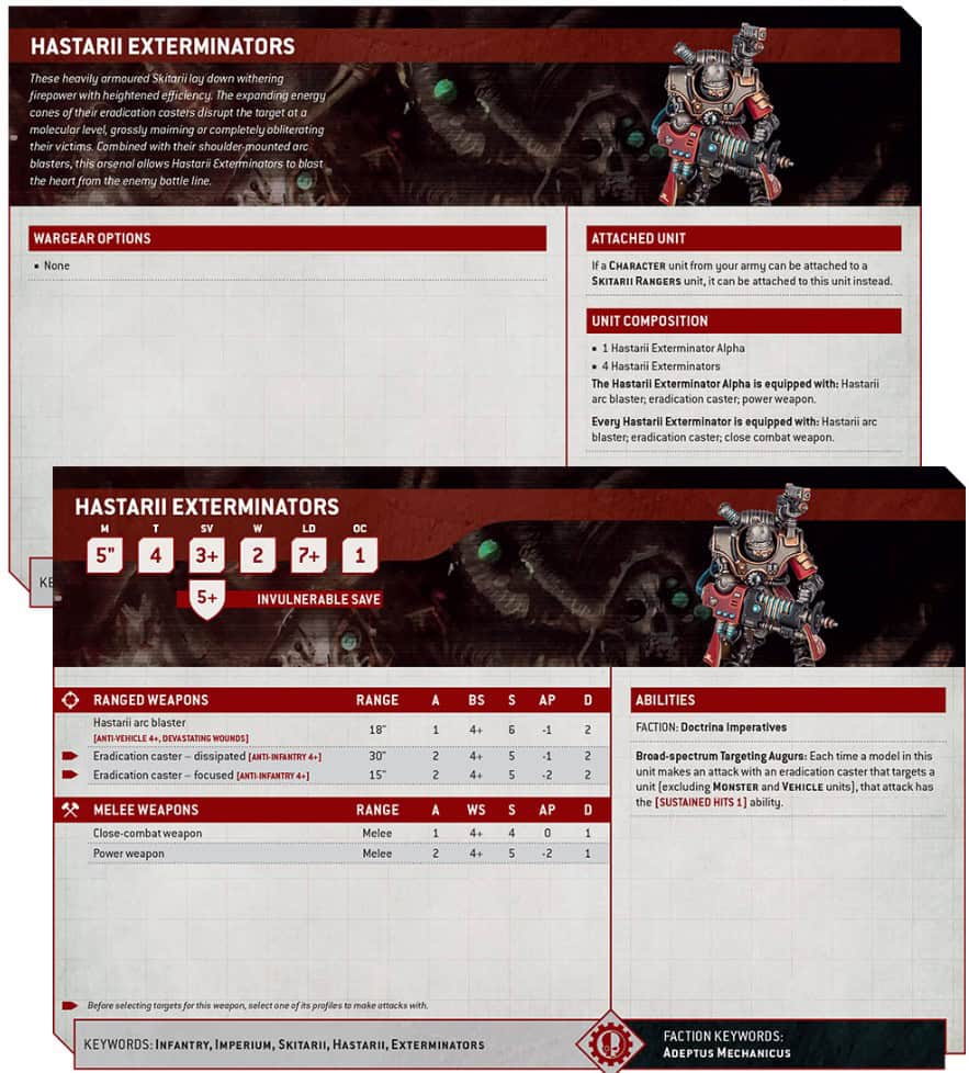 That being said, the Hastarii Exterminators rules are built to do the opposite job from the Fusiliers: clear infantry, punish elite bodies, and hose down the kind of units that normally expect to survive light and medium firepower. They still look like elite Skitarii, still pack real durability, and still have some crossover utility, but this sheet is all about deleting troops before they get to play the mission.