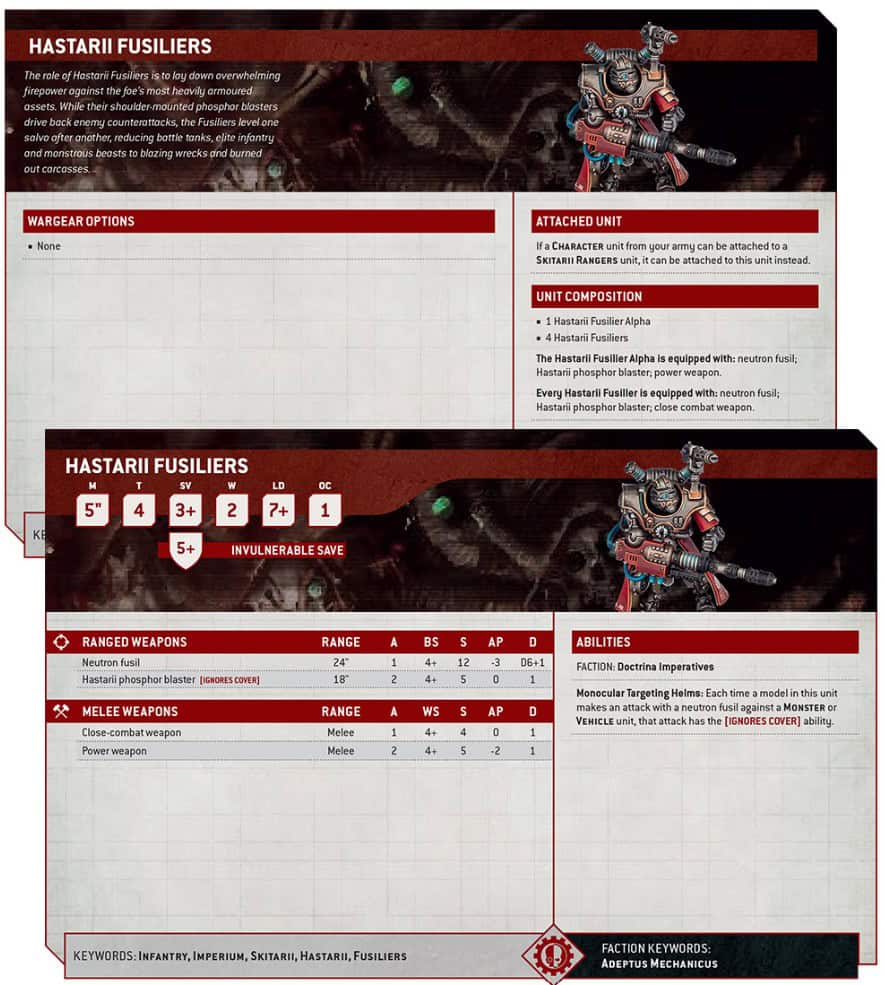 - Same premium Skitarii chassis: Movement five, Toughness four, two wounds, a three-plus save, and a five-plus invulnerable means they share the same sturdy platform as the Fusiliers.