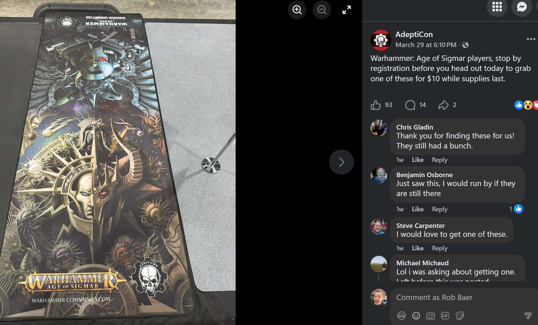 We spotted on AdeptiCon’s socials that they were clearing out the remaining Age of Sigmar logo mats, the ones used between tables in the convention hall whenever there was extra space between tournament table layout. That might just be normal cleanup. Or it might be one of those tiny clues worth filing away.