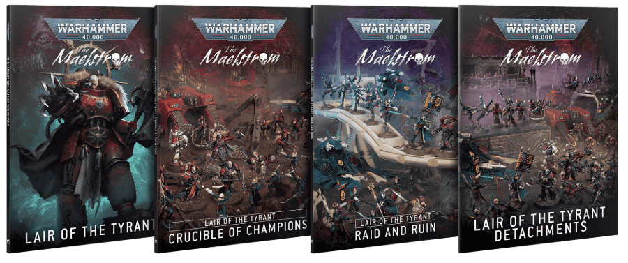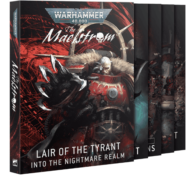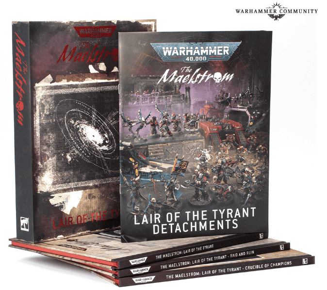 - The Maelstrom: Lair of the Tyrant is a slipcased campaign set with lore + rules, including narrative character-building and a Detachments booklet for CSM, Aeldari, Orks, and Leagues of Votann (collector version has fancier covers and red-foil/edges).