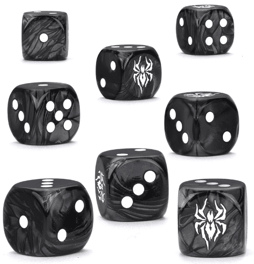 For players who want their Evil force to roll in style, the Cirith Ungol dice set brings eight smoky black dice with white pips and a spider icon on the six.