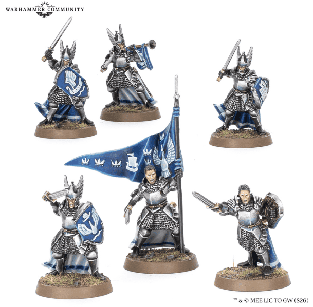 Gondor’s Swan Knights get Forge World resin reinforcements with a set of six miniatures: a Captain of Dol Amroth, a banner bearer, a war horn bearer, and three Knights with shields and hand weapons. The kit includes three copies of three shield designs, four optional unhelmeted heads, and rules in Armies of Middle-earth.