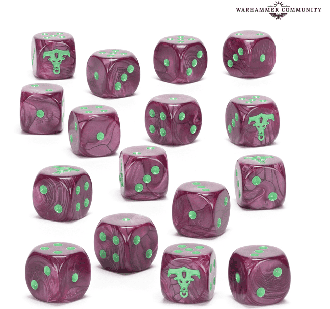Finish the look with the official dice set 16 deep purple cubes with green pips and the faction icon on the six.