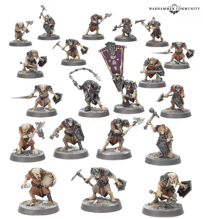 The Hobgrots are the Helsmiths’ “volunteers,” a polite term for expendable scouts. They rush ahead to trigger traps, eat artillery fire, and occasionally stab something useful. Each box builds twenty of the sneaky little brutes, complete with a champion and a heap of transfer options.