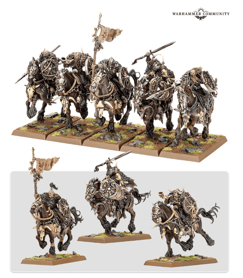 And then there’s the cavalry. The Chaos Marauder Horsemen charge in as the first wave of carnage, swinging flails and spears while sneering down from their ill-tempered steeds. Like the foot troops, each rider has two head options and a full command group, so you can easily split them into two units of five.
