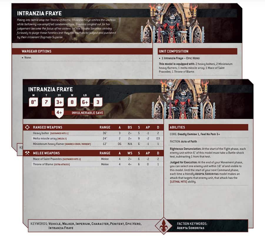 - Shooting with real flexibility: heavy bolters, a melta missile array, and a Ministorum heavy flamer gives her useful tools against infantry, tougher targets, and close-range pressure.