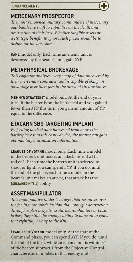 - Mercenary Prospector (Kâhl only): Each time the bearer’s unit destroys an enemy unit, you gain 2YP. Translation: put this on a unit that finishes fights and watch your YP pile up.