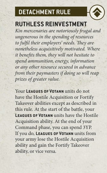 At the start of the battle, your Leagues of Votann units begin with Hostile Acquisition active. Then, at the end of your Command phase, you can spend 3YP to flip your whole army’s posture, trading Hostile Acquisition for Fortify Takeover, or swapping back the other way.