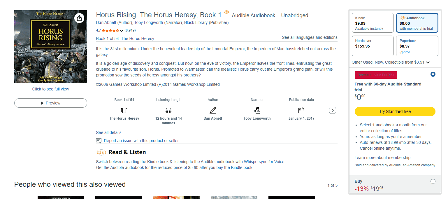 Here’s where it gets spicy: Audible frequently lists titles with member pricing and runs sales on specific books or series pages. For example, almost all the Horus Heresy audiobooks are all about 13% off right now.