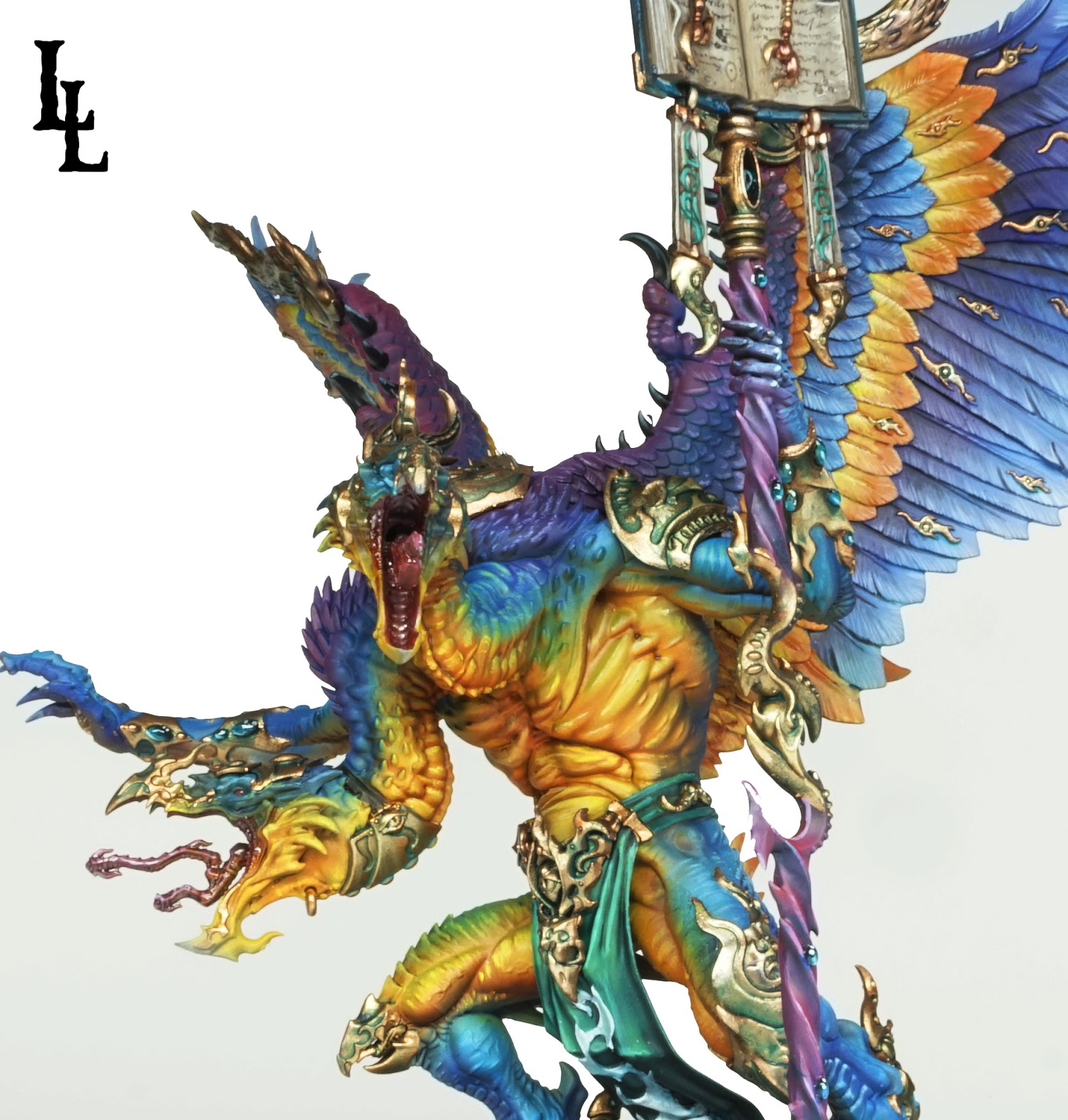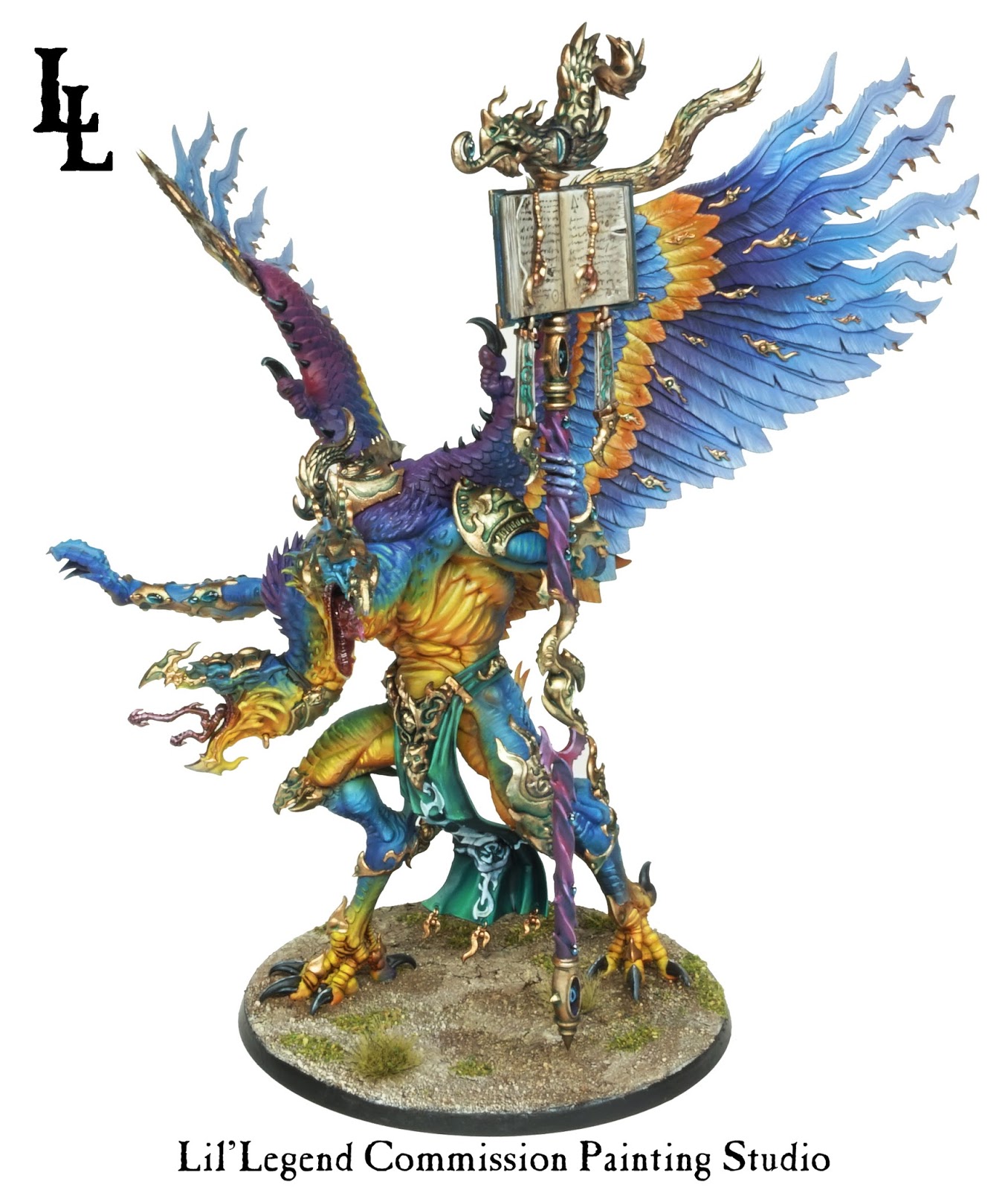 The foul corrupt physical manifestation of raw Chaos is here in the form of a Greater Daemon of Tzeentch! This epic commission from Lil’ Legend shows true talent and a knowledge of color!