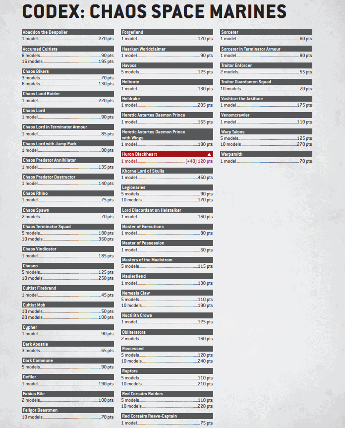 - Chaos Space Marines – Buffs: Chaos Lord in Terminator Armour down 10 and Forgefiend down 10. NERFS: Fabius Bile up 15.
