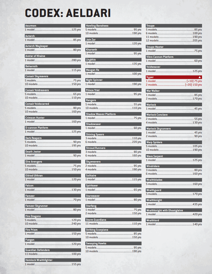 - Aeldari – Buffs: none. NERFS: Eldrad up 10, Fire Dragons (10) up 20, Jain Zar up 15, Lhykhis up 15, Storm Guardians up 10, Swooping Hawks up 10, Warp Spiders up 10.