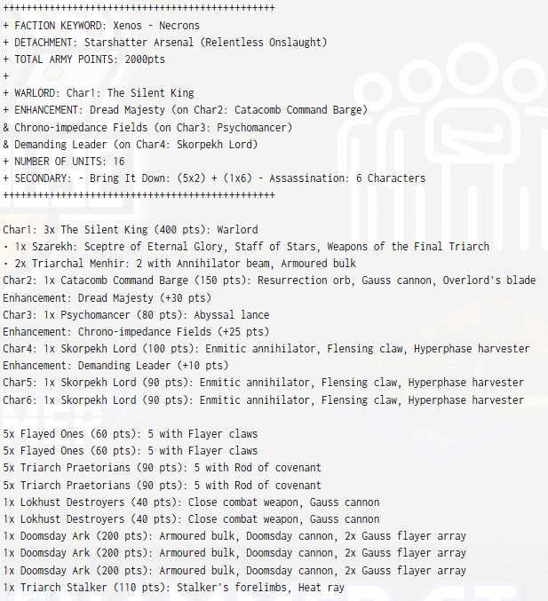 The list tosses aside the traditional Necron “bricks” (Wraiths / Warriors) for tons of efficient datasheets. One of the strong points of Necrons right now is their trash, and he took a lot of it here.