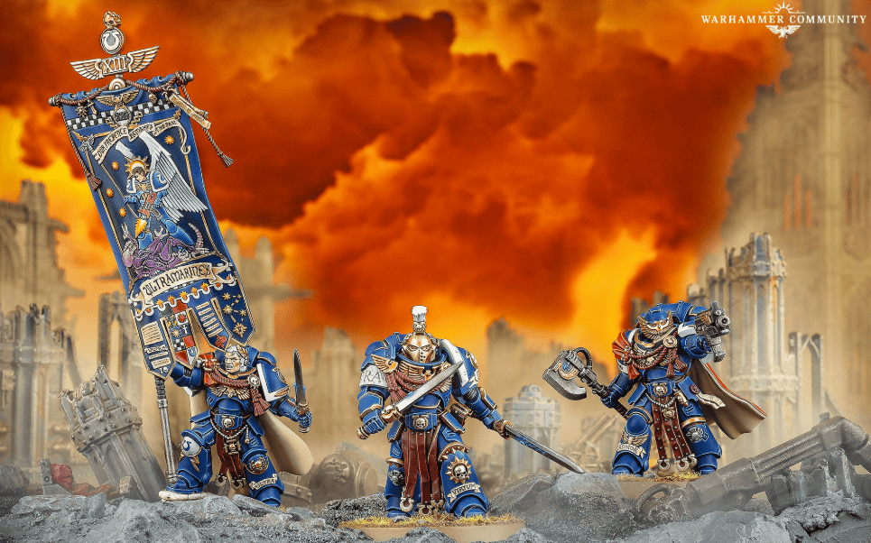 One model can be built as a Chapter Champion, and another as a Chapter Ancient carrying the massive Banner of Macragge. This might be the biggest flag Warhammer has ever seen, dripping with Ultramar iconography.