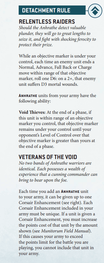 - Sticky control, Corsair style: At the end of a phase, if an Anhrathe unit is within range of an objective marker you control, that objective stays under your control until your opponent’s Level of Control over it is greater than yours at the end of a phase.