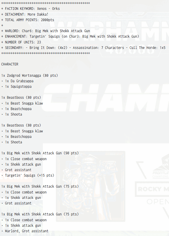 The Rocky Mountain Open showcased Ork domination, with Zach Point leading the charge alongside Ben Jurek and Michael Mann. All of them together proved that green means winning! The new More Dakka detachment might be causing chaos and may need an adjustment soon. At least two big events being swept by Orks in one weekend is no small feat!