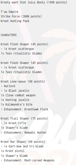 This is not a polite Tau gunline. This is a feral carpet of Kroot bodies backed up by stampeding Krootox, all wrapped in just enough tricks to make it a nightmare to pin down.