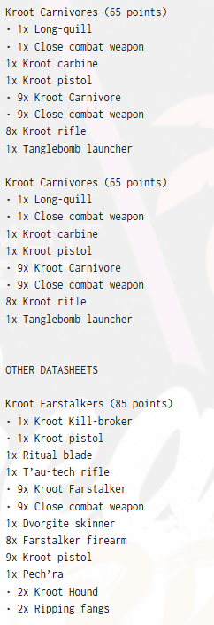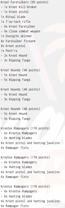 Two full bricks of twenty Kroot Carnivores and four smaller ten-strong squads form the backbone.