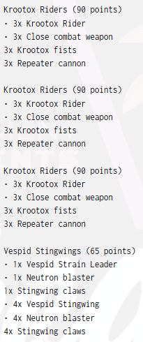A single unit of Vespid Stingwings rounds things out with speed and precision. They drop in, pick up a small unit, threaten a backfield objective, or score a key secondary.