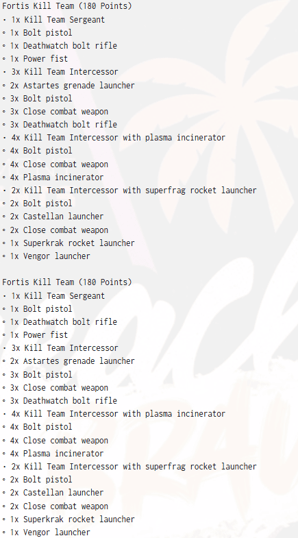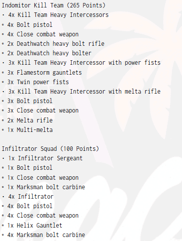 Fortis and Indomitor Kill Teams round it out by flexing into whatever matchup you drew, and the Infiltrators handle the boring screens, so you are not losing to a random deep strike gotcha.