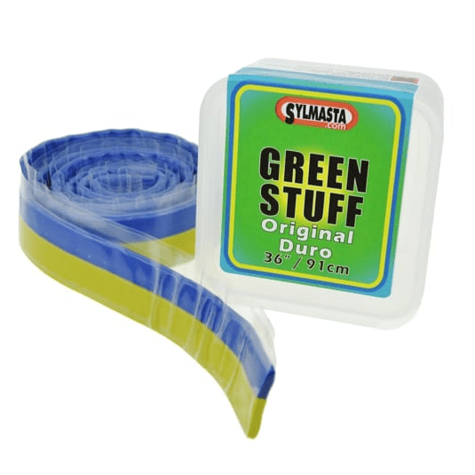 Green Stuff is a two-part epoxy putty, traditionally sold as a blue-and-yellow strip. Mix the two parts, and you get that classic green working putty that cures at room temperature. Working time is usually in the neighborhood of one to two hours, depending on the mix and conditions.
