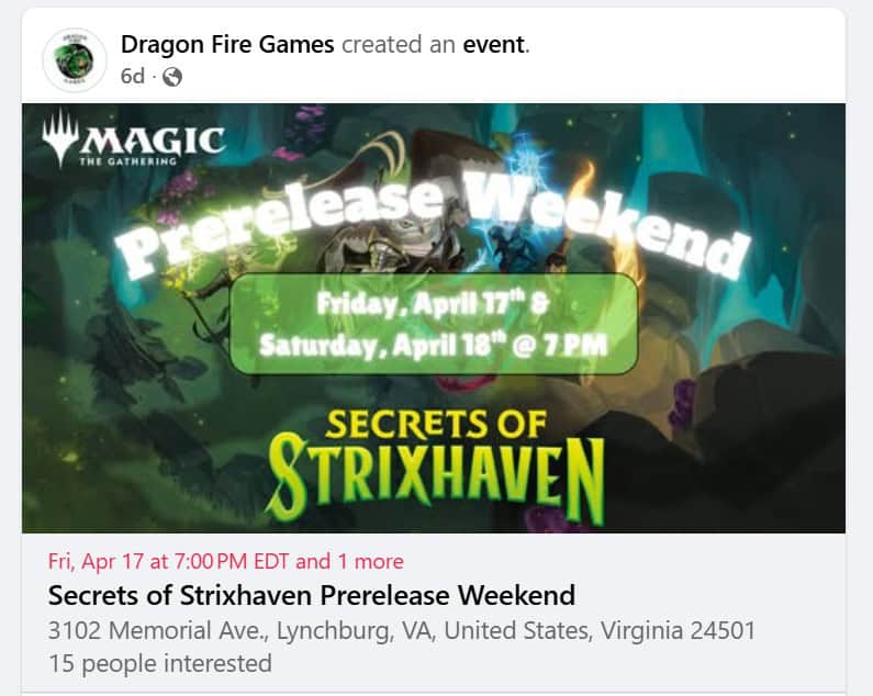 Dragon Fire Games (follow them here) is still planning to host the new Strixhaven Prerelease on the following Friday and Saturday at the new building. The shop says it will have 54 spots open for each event, which is the most room it has ever had to run comfortably. They are also a full GW retailer, so the next time a pre-order goes live, try to order some from them.