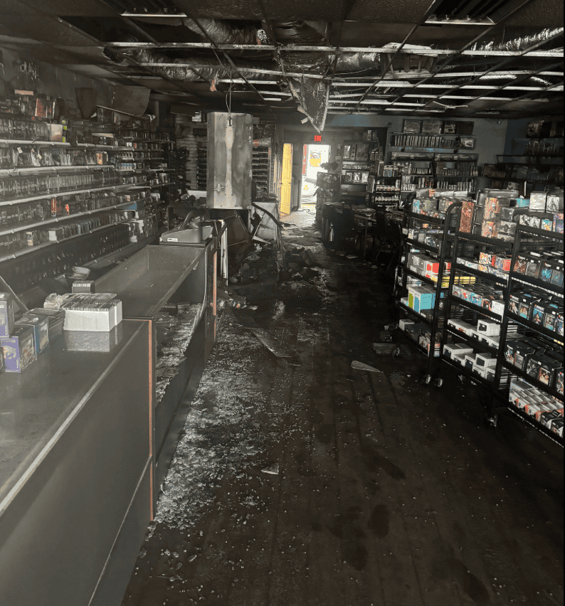 After the robbery, the suspect reportedly spread gasoline from the display cases to the front door and set the store on fire. Fire crews put out the blaze quickly, but the damage to the main floor and office area was still extensive. Smoke and fire damage hit nearly everything in those spaces, and the store estimates it lost around 65% of its merchandise.