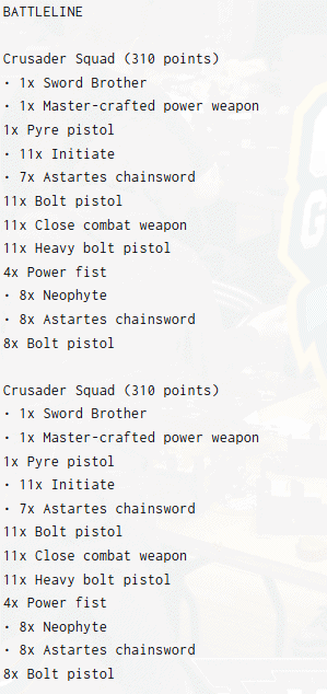 Then come the stars. Three massive Crusader Squads, each stuffed with Initiates, Neophytes, power fists, and angry zealot energy. These are your objective holders, board control pieces, and primary damage dealers all rolled into one.
