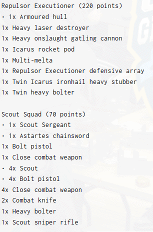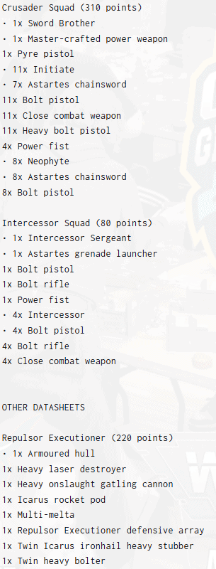 This Black Templars Army list, using Gladius Task Force, hits the table with a simple battle plan. The characters supercharge giant Crusader blobs; those blobs run screaming into the midfield, and the Executioners blast anything tough enough to survive the first wave.