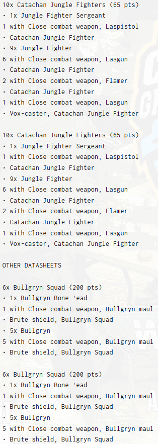 The Catachan Jungle Fighters bring flamers and aggression. They bully light units, hold ruins, and screen for the tanks.
