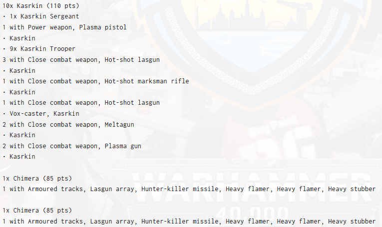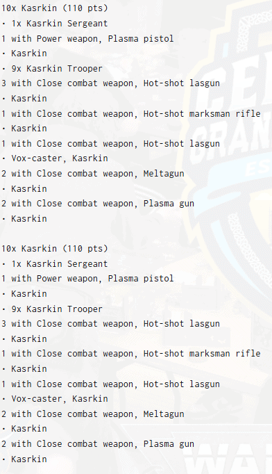After them, three squads of Kasrkin handle the precision killing. Meltaguns and plasma let them crack armor, finish weakened units, and score secondaries with ease.