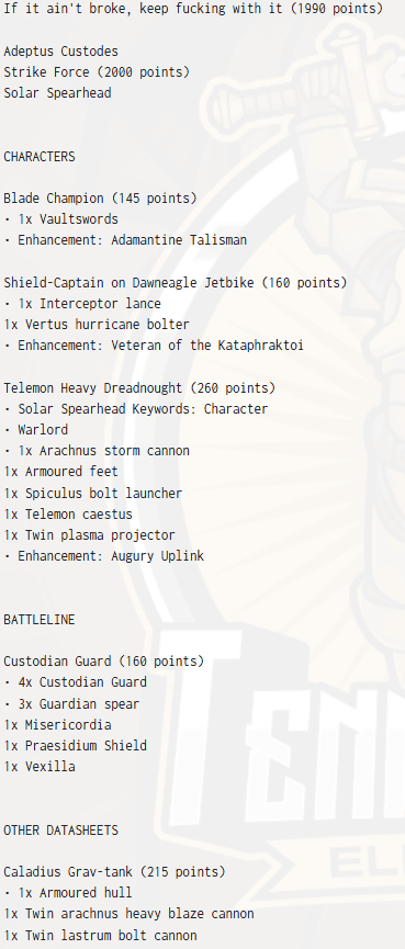 2nd Place: Jeremy Stan, Adeptus Custodes Army Lists