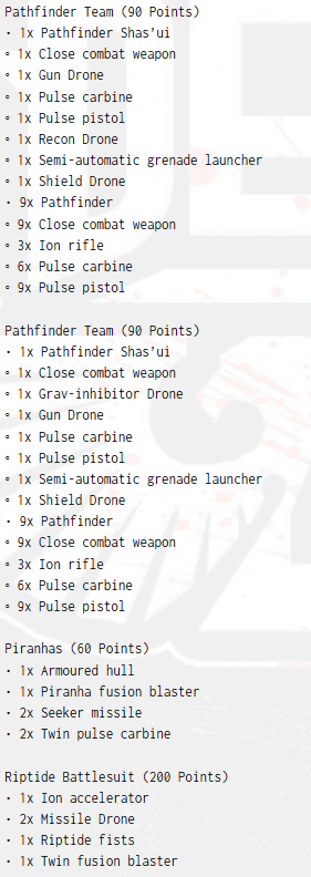 Pathfinder Teams are where the list’s engine really starts purring. Markerlight spotting is a big deal for this list, since ignoring cover turns “pretty good” shooting into “why did that unit evaporate” shooting.