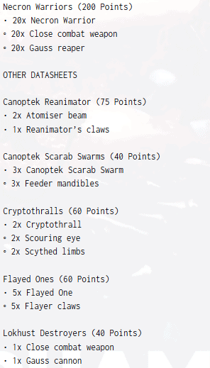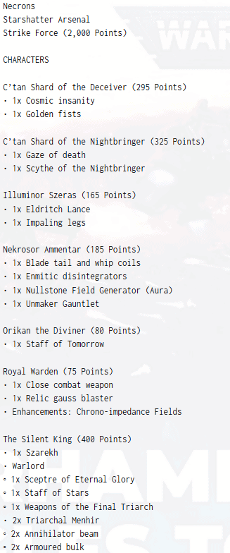 This Necrons Starshatter Arsenal list wants to hit the table like a slow-moving disaster, jam the middle of the board with problems, and make the opponent decide which nightmare needs dealing with first.