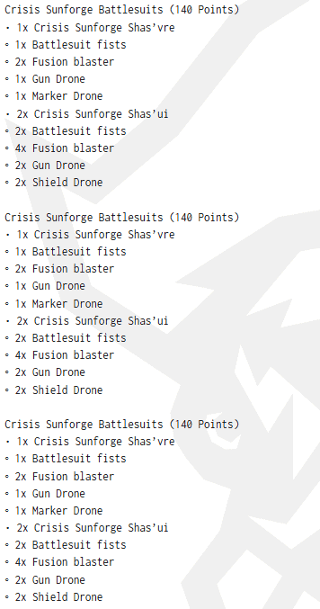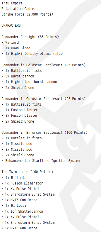 If you like T’au lists that skip the polite introductions and get straight to removing models, this Retaliation Cadre is worth a look. It’s a clean, brutal setup where every suit team has a job, and none of them are wasting time pretending to be flexible.