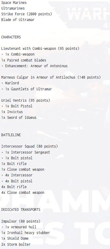 This Blade of Ultramar Space Marines army list plants a durable center with Calgar, the Victrix Honour Guard, Company Heroes, and the Wardens, then lets the armor line go to work. Double Ballistus, a Gladiator Lancer, and two Repulsor Executioners give the list a ridiculous amount of long-range pressure, so enemy tanks, elite infantry, and anything trying to stage safely are all living on borrowed time.
