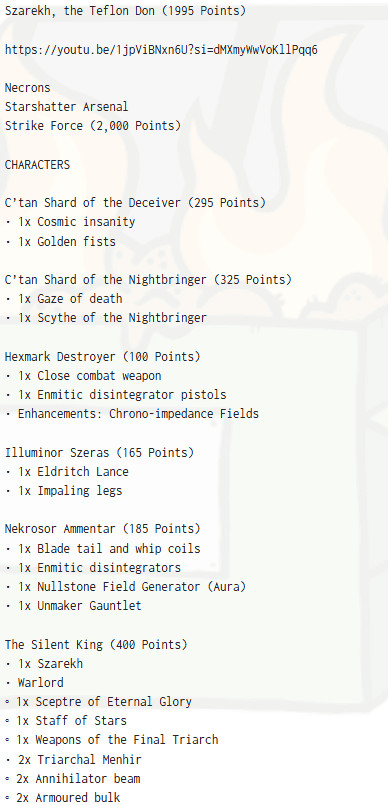 This build is pure target overload, and that’s what makes it so nasty. Your opponent isn’t staring down one must-kill threat; they’re staring at multiple C’tan, the Silent King, and a pile of support pieces all demanding attention at the same time.