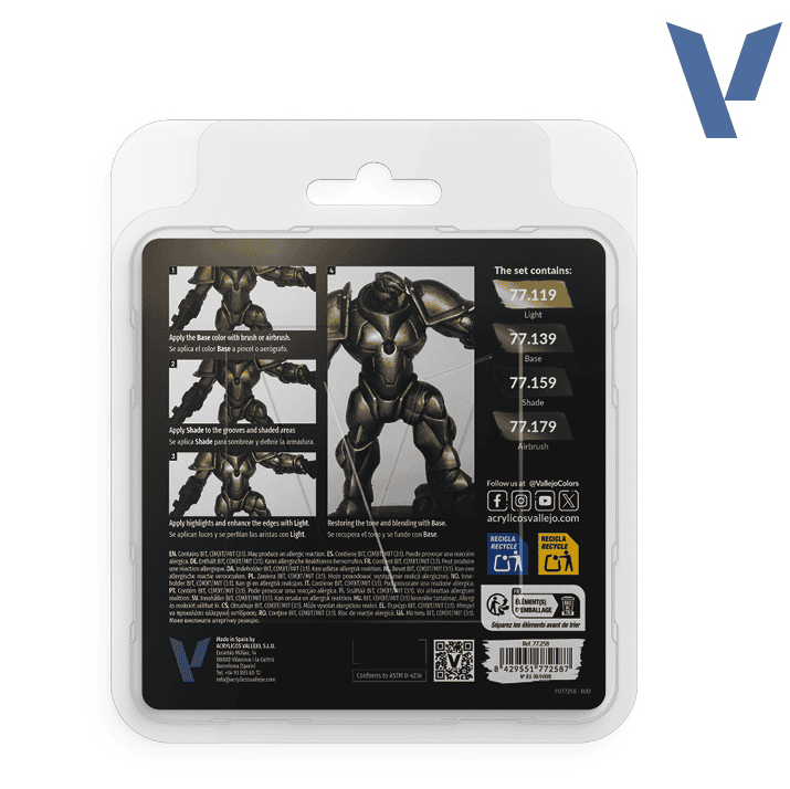 There are 80 metallic tones total, divided into 20 BSL families. Every family includes four shades: Base, Shade, Light, and an Airbrush version. This setup keeps everything consistent, letting you mix, highlight, and shade like a pro, even if it’s your first time working with metallic paints.
