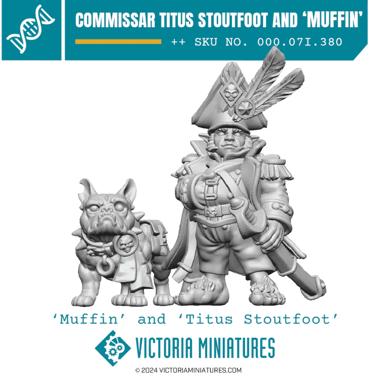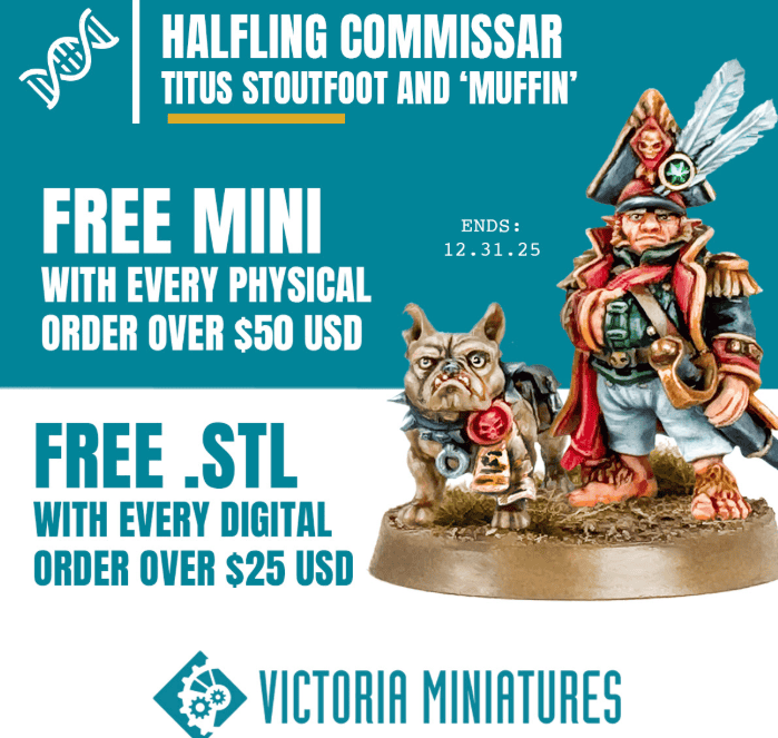 Victoria Miniatures is wrapping up 2025 in style with one last freebie, and it’s a showstopper. Meet the Halfling Commissar Titus Stoutfoot and his loyal companion Muffin.